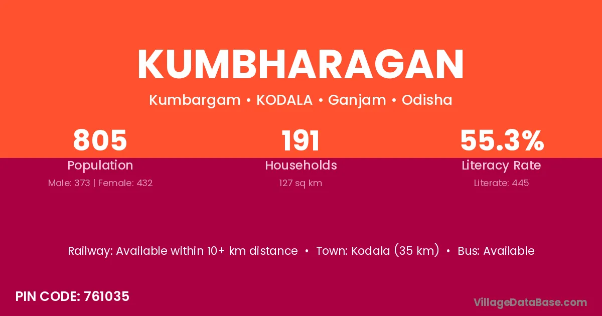 Kodala (35 km) is the nearest town to Kumbharagan village for major economic activities and is located approximately 35 km away.