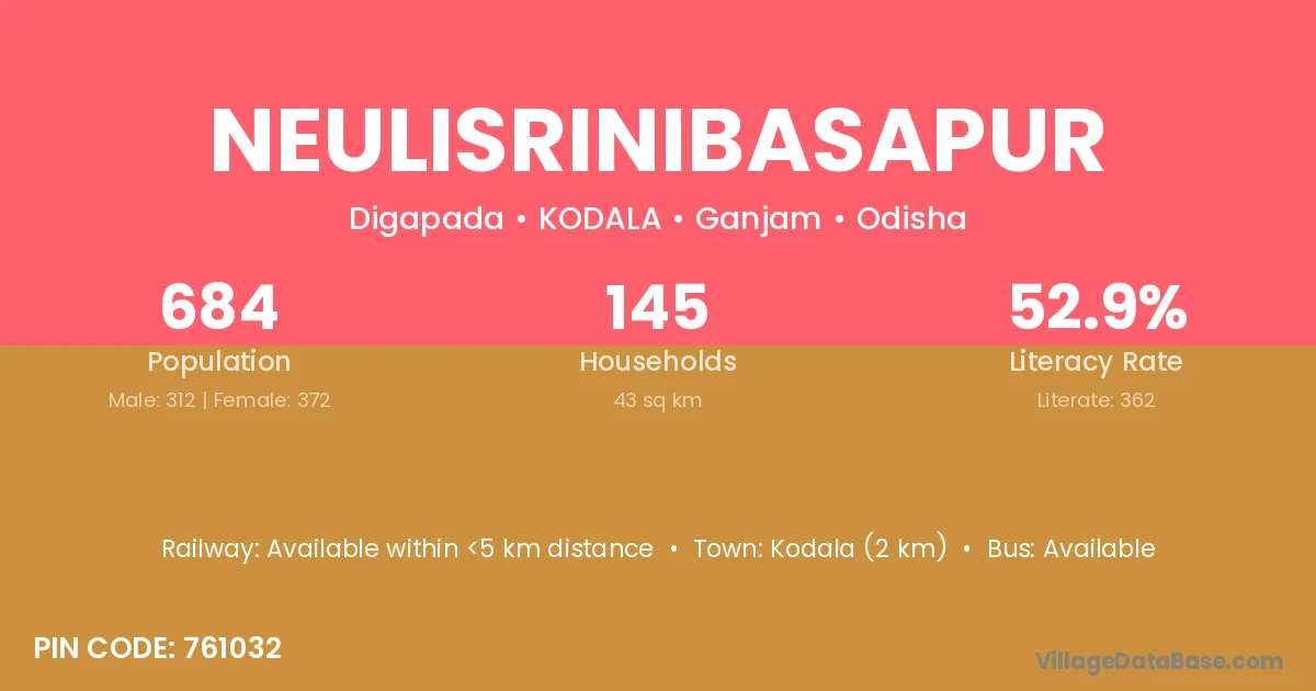 Kodala (2 km) is the nearest town to Neulisrinibasapur village for major economic activities and is located approximately 2 km away.