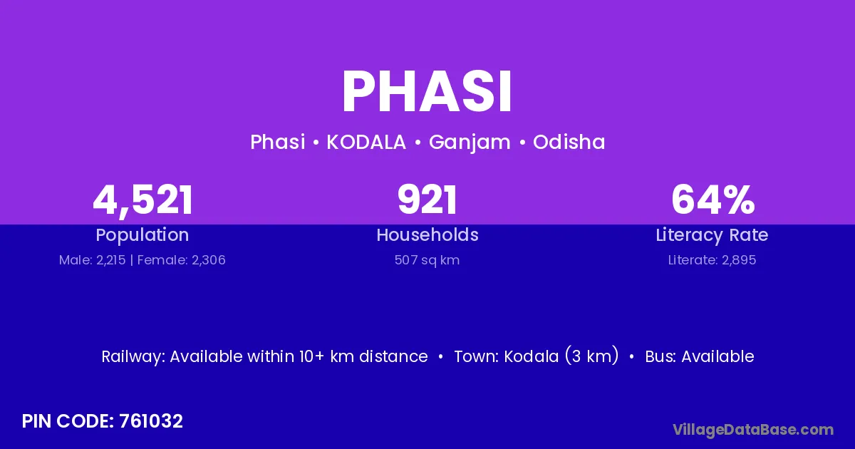 Kodala (3 km) is the nearest town to Phasi village for major economic activities and is located approximately 3 km away.