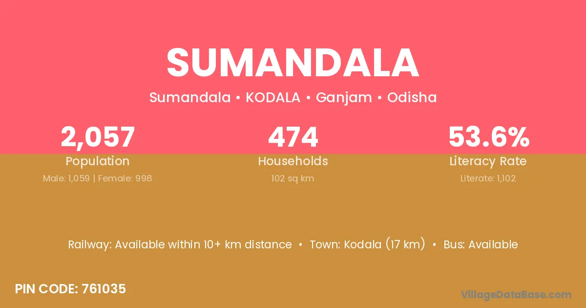 Kodala (17 km) is the nearest town to Sumandala village for major economic activities and is located approximately 17 km away.