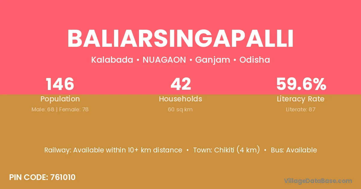 Chikiti (4 km) is the nearest town to Baliarsingapalli village for major economic activities and is located approximately 4 km away.