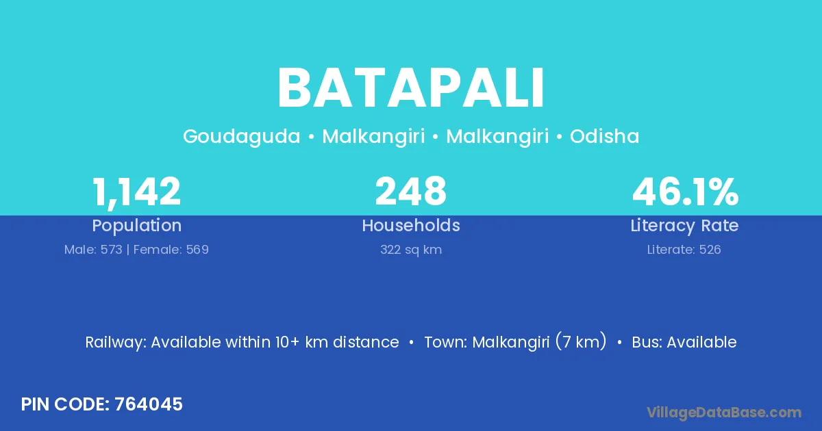 Chikiti (1 km) is the nearest town to Batapali village for major economic activities and is located approximately 1 km away.
