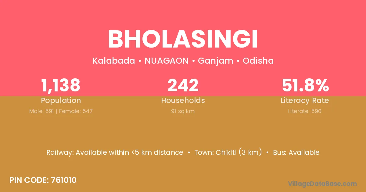 Bholasingi village has a total population of 1,138 people, of which 591 are males and 547 are females.