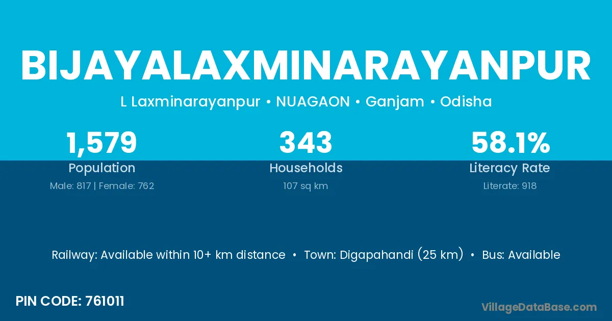 Digapahandi (25 km) is the nearest town to Bijayalaxminarayanpur village for major economic activities and is located approximately 25 km away.