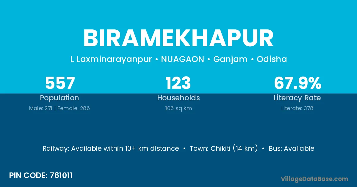 Chikiti (14 km) is the nearest town to Biramekhapur village for major economic activities and is located approximately 14 km away.