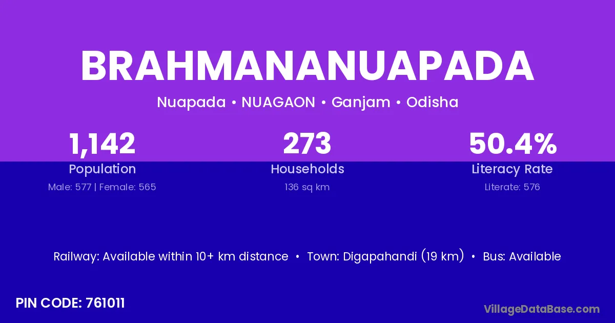 Brahmananuapada village has a total population of 1,142 people, of which 577 are males and 565 are females.