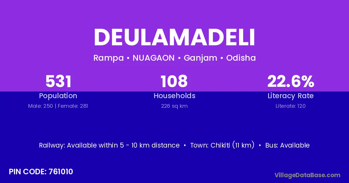 Chikiti (11 km) is the nearest town to Deulamadeli village for major economic activities and is located approximately 11 km away.