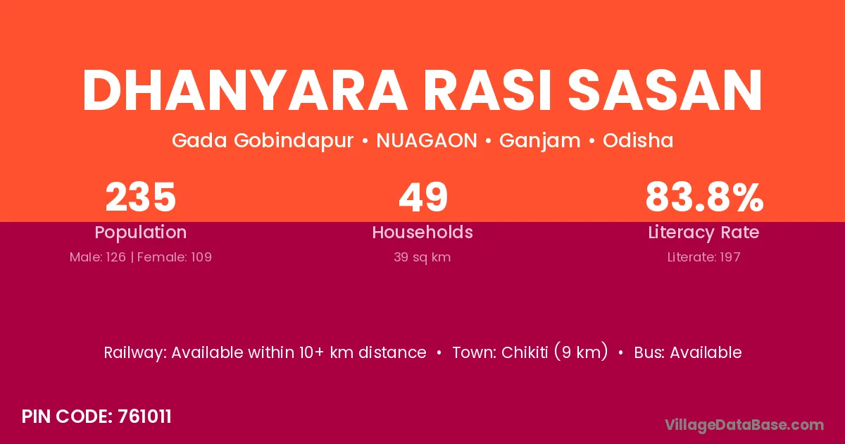 Dhanyara Rasi Sasan village has a total population of 235 people, of which 126 are males and 109 are females.