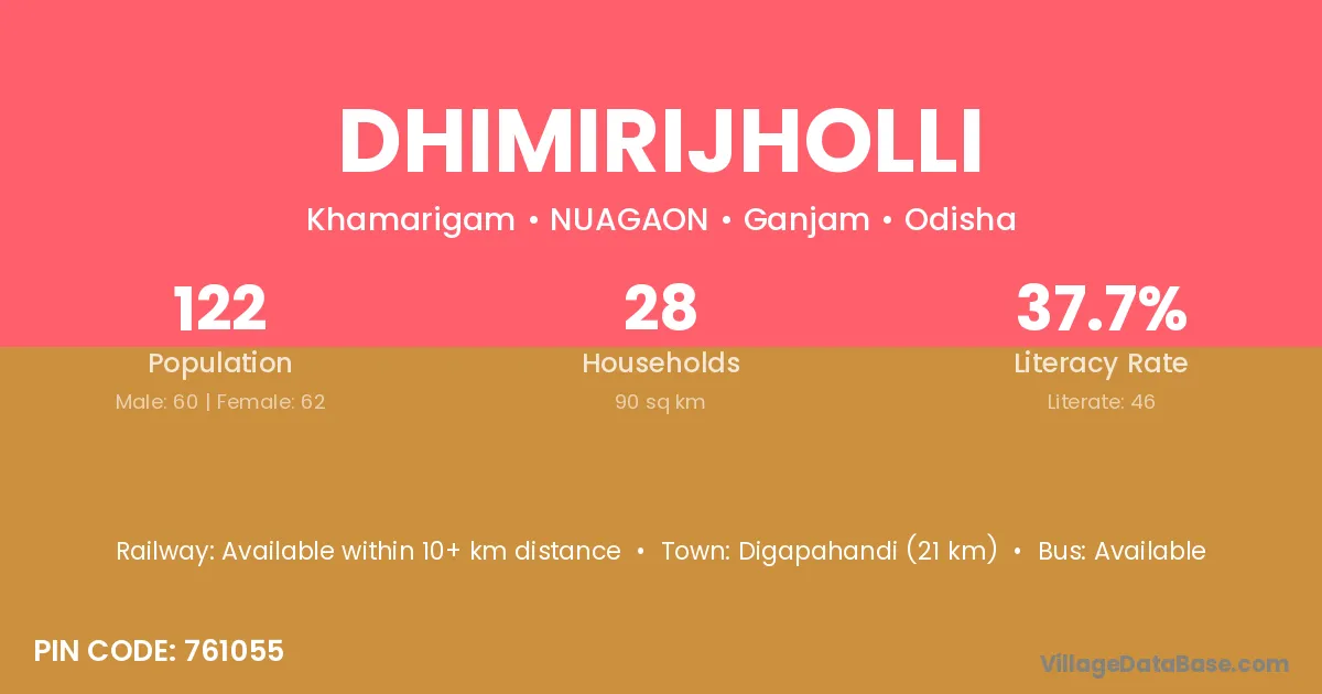 Digapahandi (21 km) is the nearest town to Dhimirijholli village for major economic activities and is located approximately 21 km away.