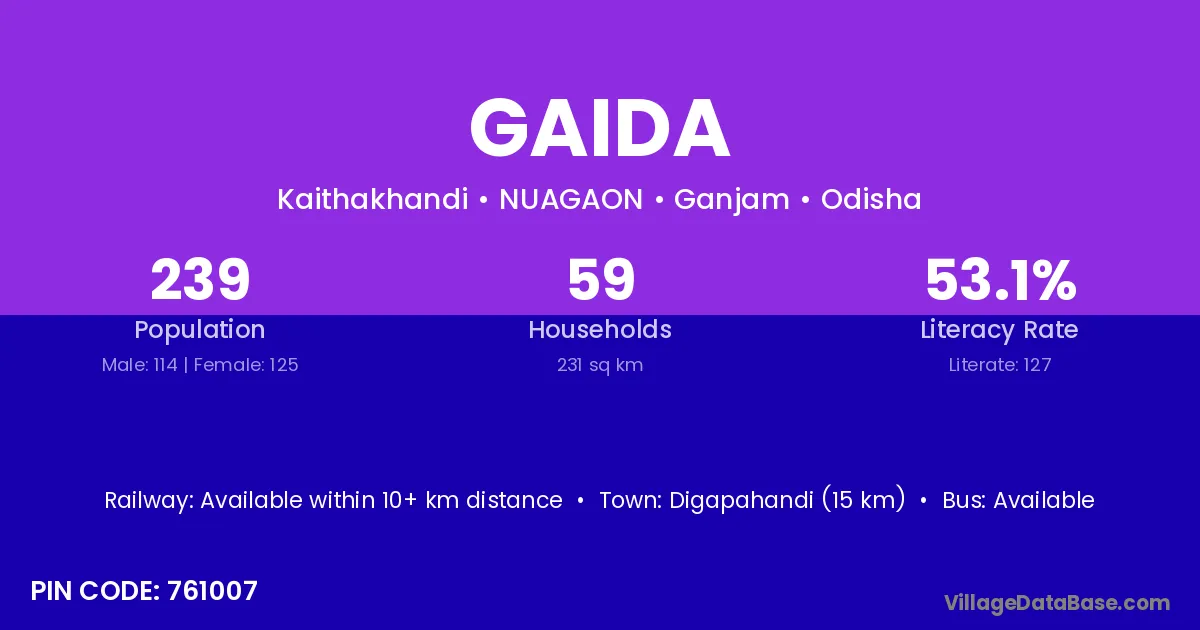 Digapahandi (15 km) is the nearest town to Gaida village for major economic activities and is located approximately 15 km away.