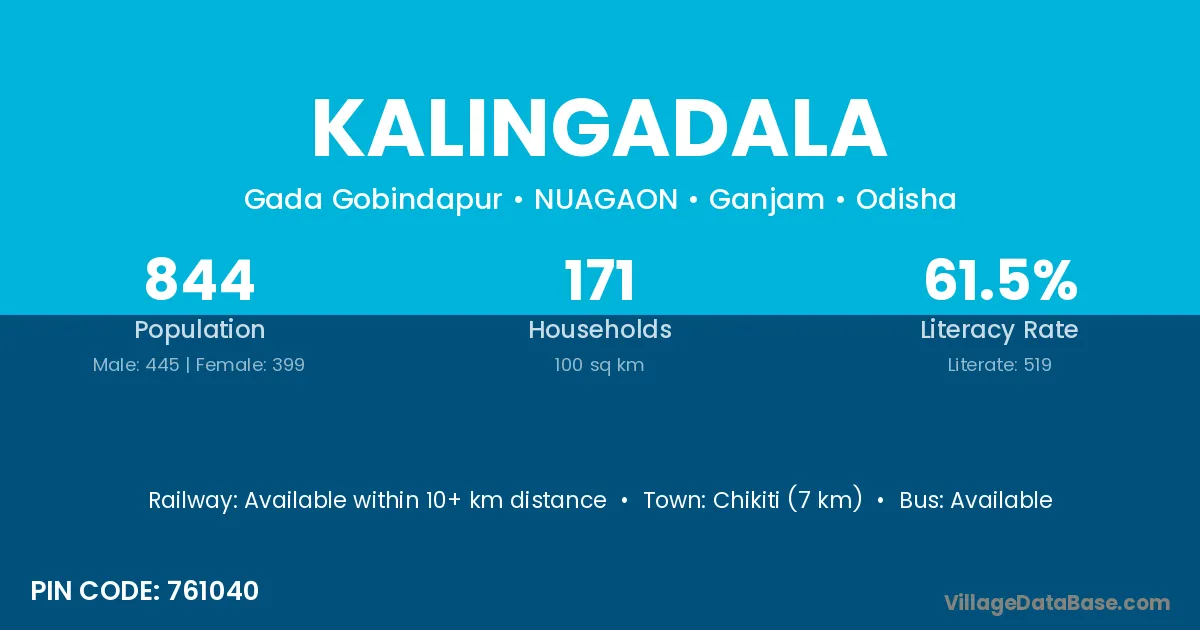 Chikiti (7 km) is the nearest town to Kalingadala village for major economic activities and is located approximately 7 km away.