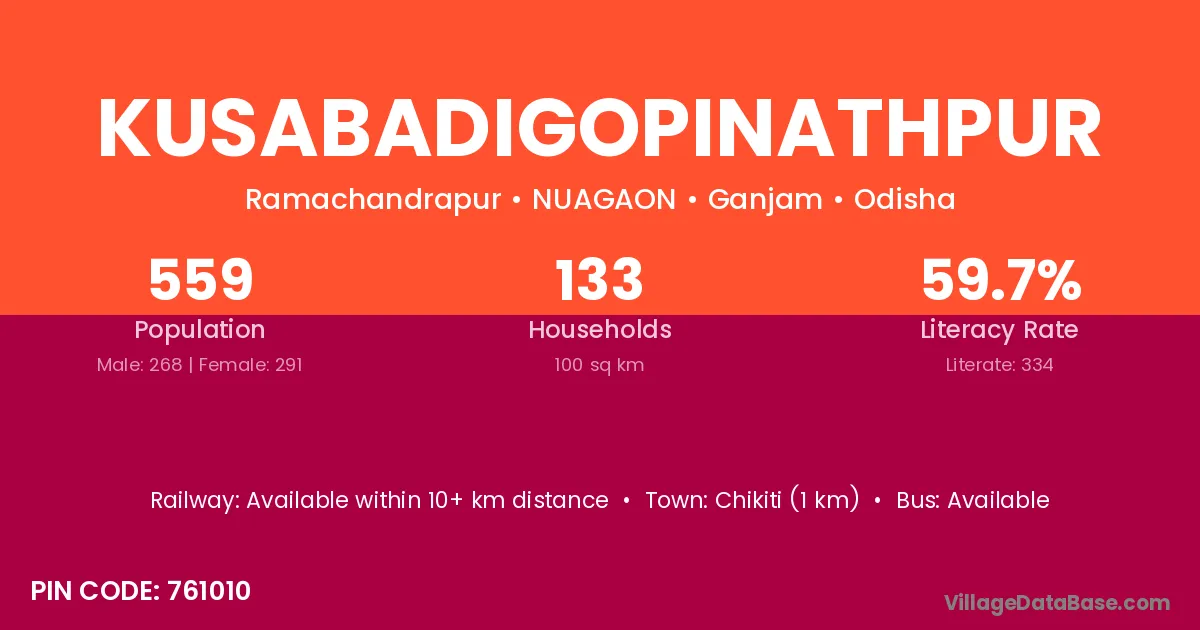 Chikiti (1 km) is the nearest town to Kusabadigopinathpur village for major economic activities and is located approximately 1 km away.