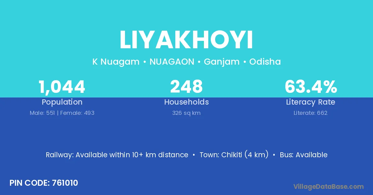 Chikiti (4 km) is the nearest town to Liyakhoyi village for major economic activities and is located approximately 4 km away.