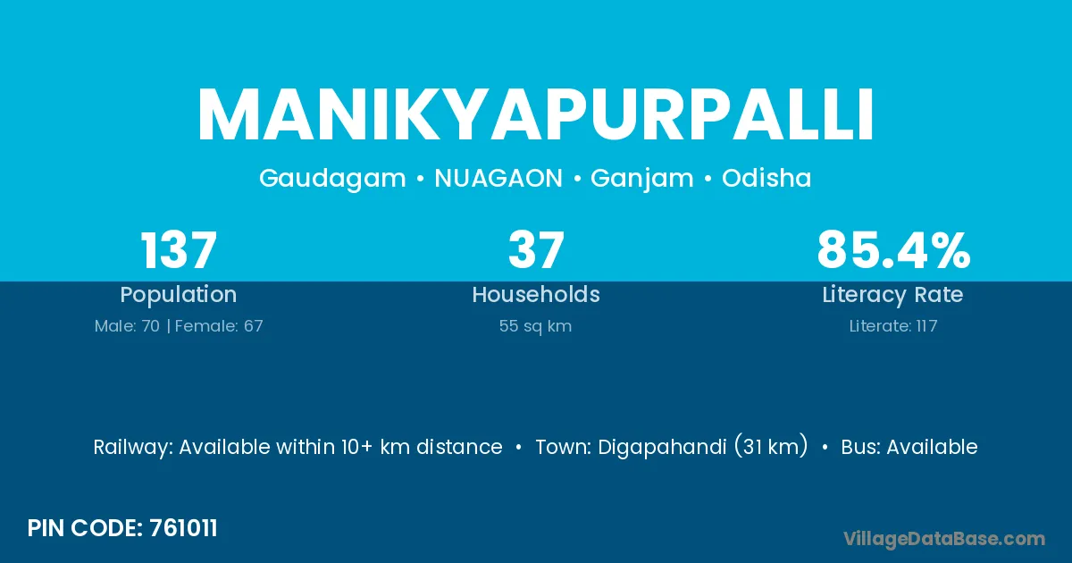 Digapahandi (31 km) is the nearest town to Manikyapurpalli village for major economic activities and is located approximately 31 km away.