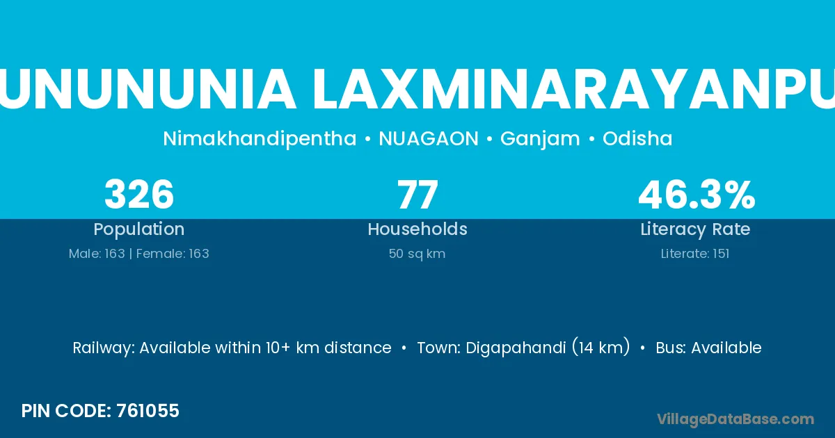 Digapahandi (14 km) is the nearest town to Nunununia Laxminarayanpur village for major economic activities and is located approximately 14 km away.