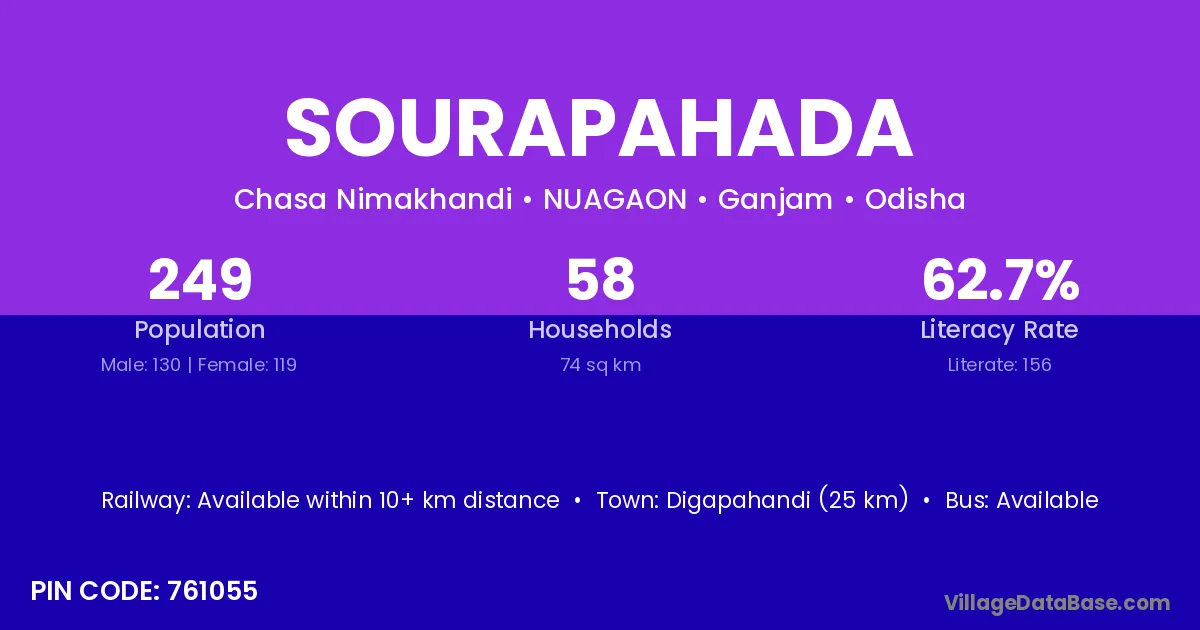 Digapahandi (25 km) is the nearest town to Sourapahada village for major economic activities and is located approximately 25 km away.