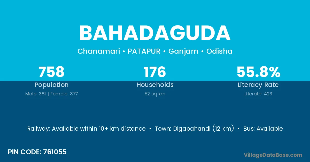 Digapahandi (12 km) is the nearest town to Bahadaguda village for major economic activities and is located approximately 12 km away.