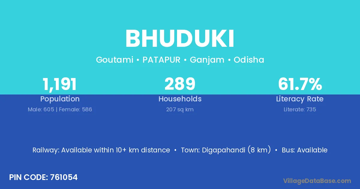 Digapahandi (8 km) is the nearest town to Bhuduki village for major economic activities and is located approximately 8 km away.