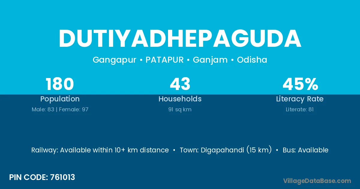 Dutiyadhepaguda village has a total population of 180 people, of which 83 are males and 97 are females.