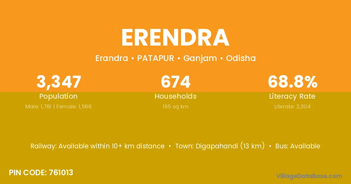 Digapahandi (13 km) is the nearest town to Erendra village for major economic activities and is located approximately 13 km away.