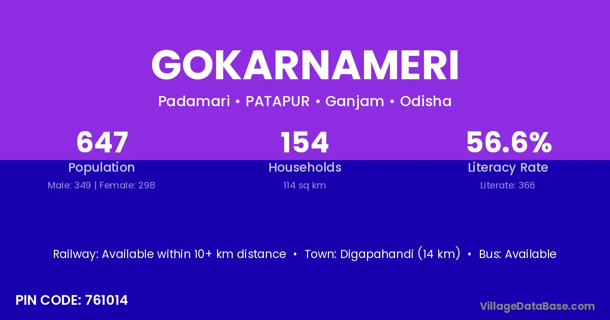 Gokarnameri village has a total population of 647 people, of which 349 are males and 298 are females.
