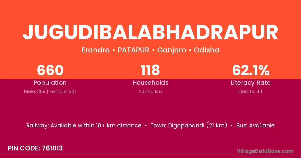Digapahandi (21 km) is the nearest town to Jugudibalabhadrapur village for major economic activities and is located approximately 21 km away.
