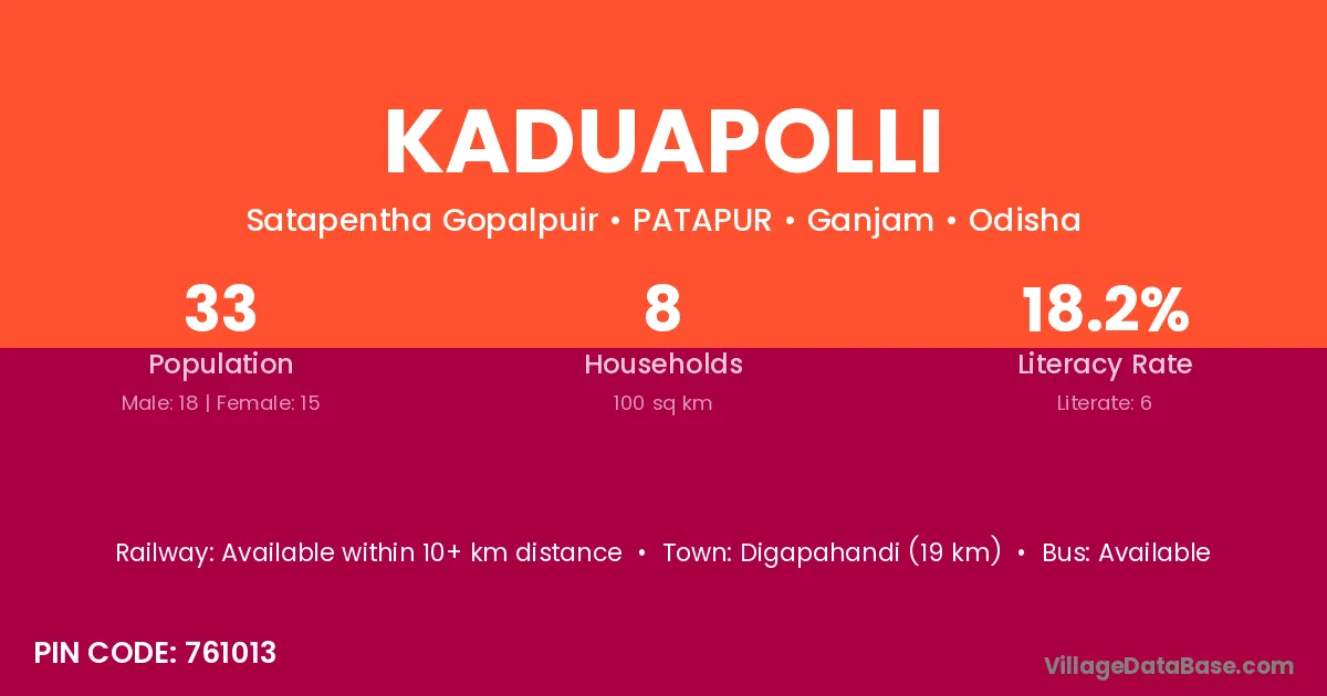 Digapahandi (19 km) is the nearest town to Kaduapolli village for major economic activities and is located approximately 19 km away.