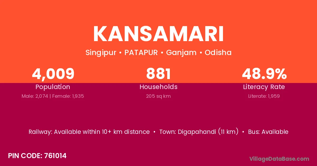 Digapahandi (11 km) is the nearest town to Kansamari village for major economic activities and is located approximately 11 km away.