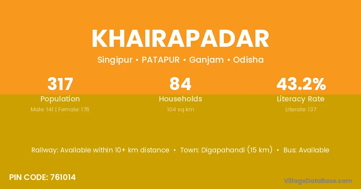 Digapahandi (15 km) is the nearest town to Khairapadar village for major economic activities and is located approximately 15 km away.
