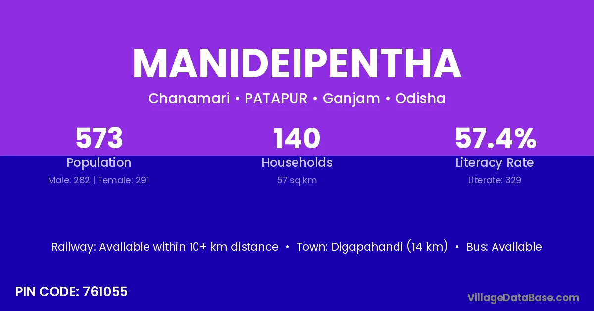 Digapahandi (14 km) is the nearest town to Manideipentha village for major economic activities and is located approximately 14 km away.