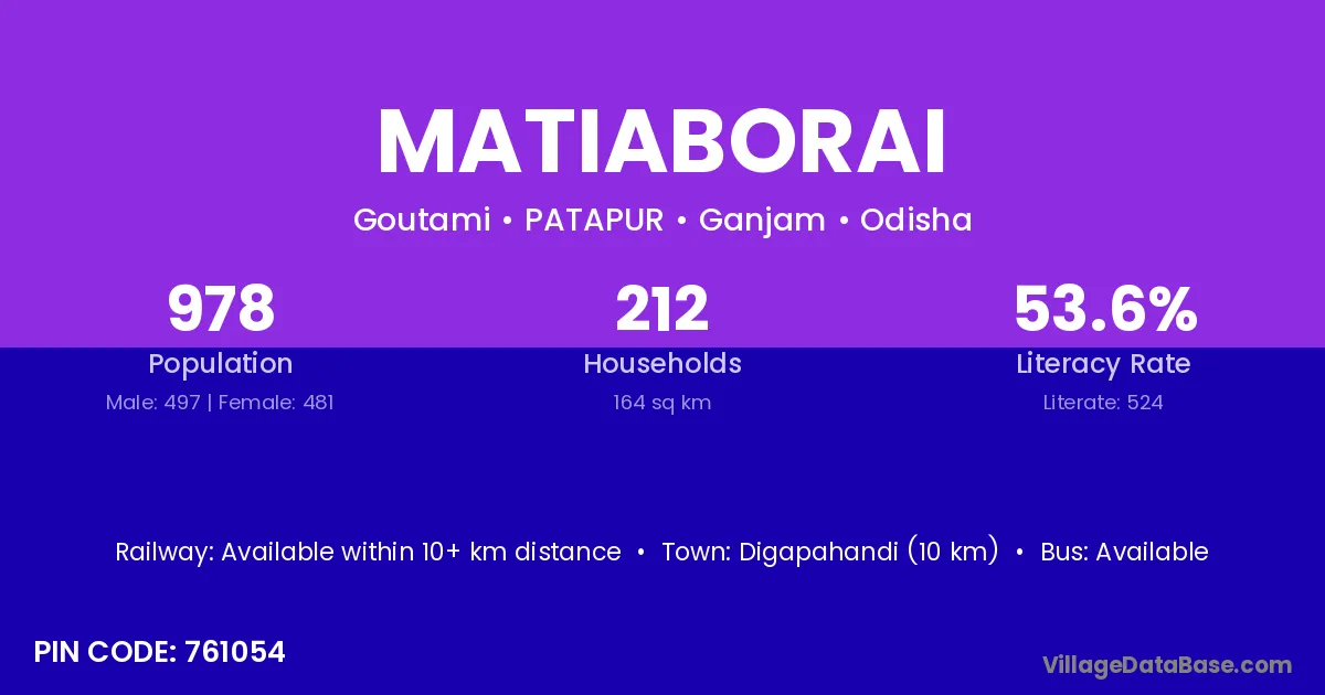 Matiaborai village has a total population of 978 people, of which 497 are males and 481 are females.