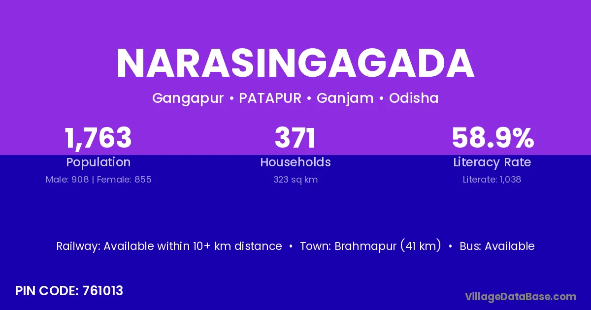 Brahmapur (41 km) is the nearest town to Narasingagada village for major economic activities and is located approximately 41 km away.