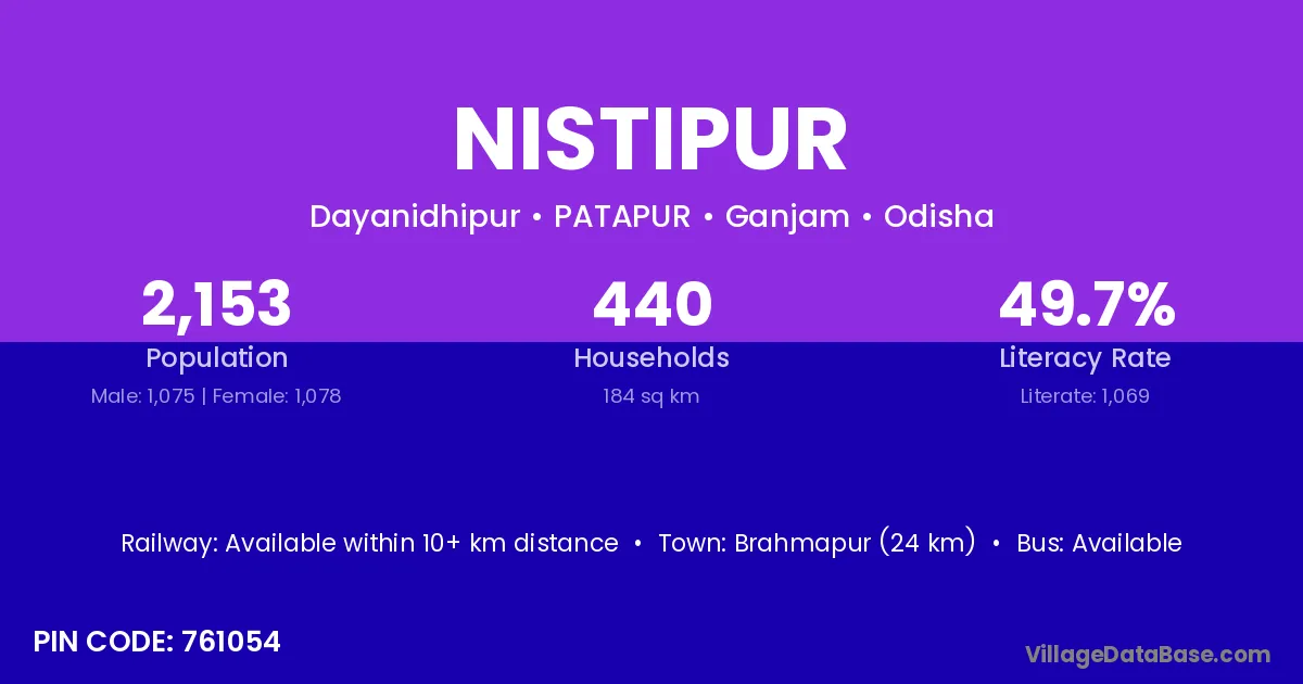Brahmapur (24 km) is the nearest town to Nistipur village for major economic activities and is located approximately 24 km away.