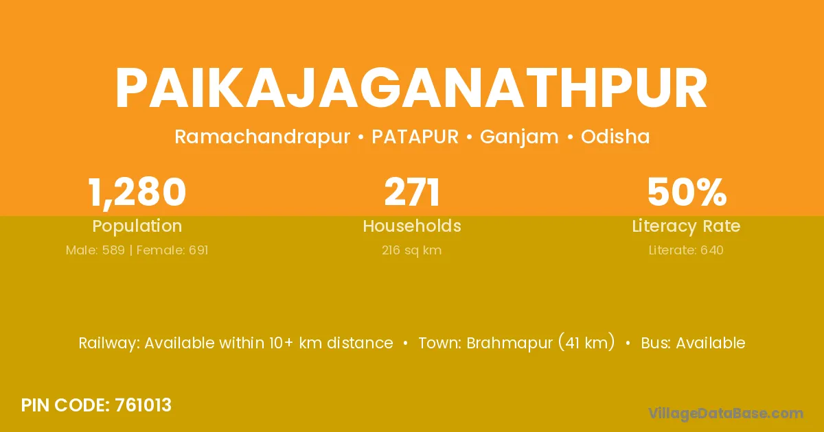 Brahmapur (41 km) is the nearest town to Paikajaganathpur village for major economic activities and is located approximately 41 km away.