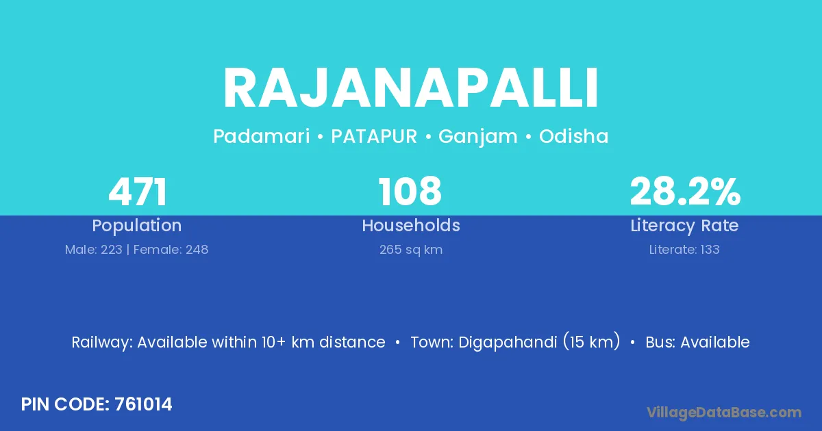 Digapahandi (15 km) is the nearest town to Rajanapalli village for major economic activities and is located approximately 15 km away.