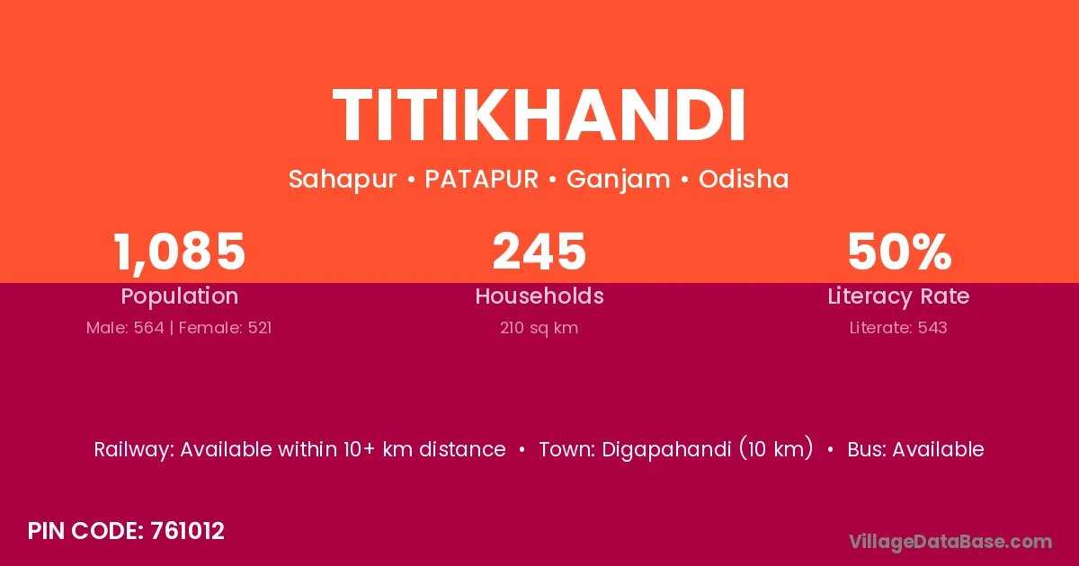 Digapahandi (10 km) is the nearest town to Titikhandi village for major economic activities and is located approximately 10 km away.