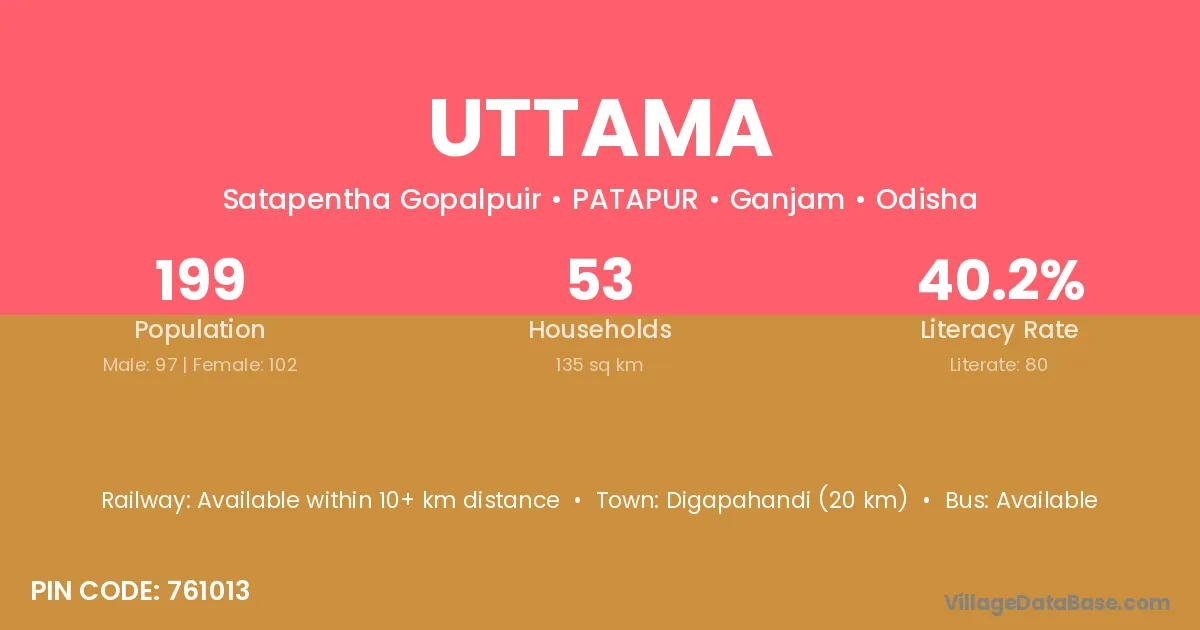 Digapahandi (20 km) is the nearest town to Uttama village for major economic activities and is located approximately 20 km away.