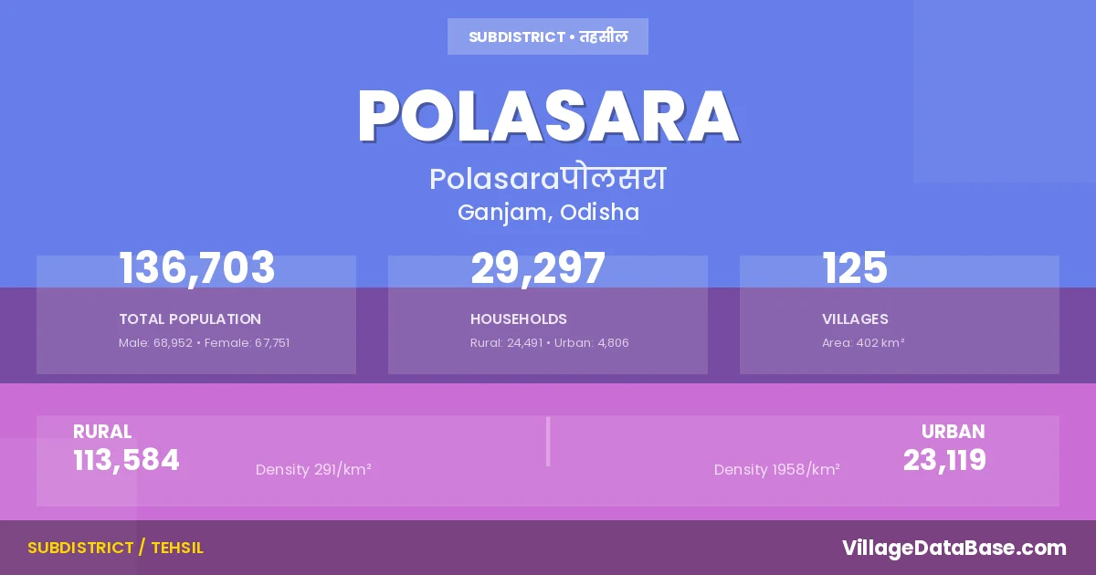 According to the 2011 census The total area of POLASARA Tehsil is 402 km², with a population of 136703 people. The population density is 340 inhabitants per square kilometre, and there are approximately 29297 houses in the sub district.