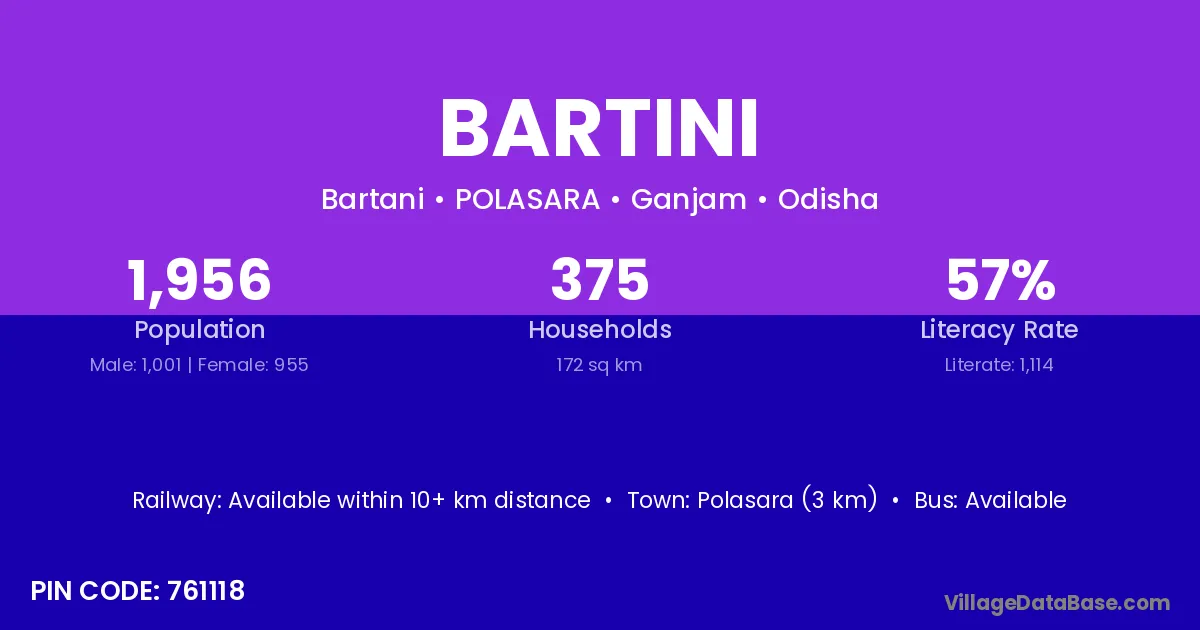 Polasara (3 km) is the nearest town to Bartini village for major economic activities and is located approximately 3 km away.
