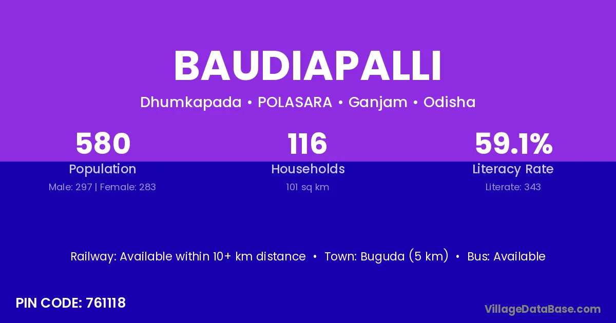 Baudiapalli village has a total population of 580 people, of which 297 are males and 283 are females.