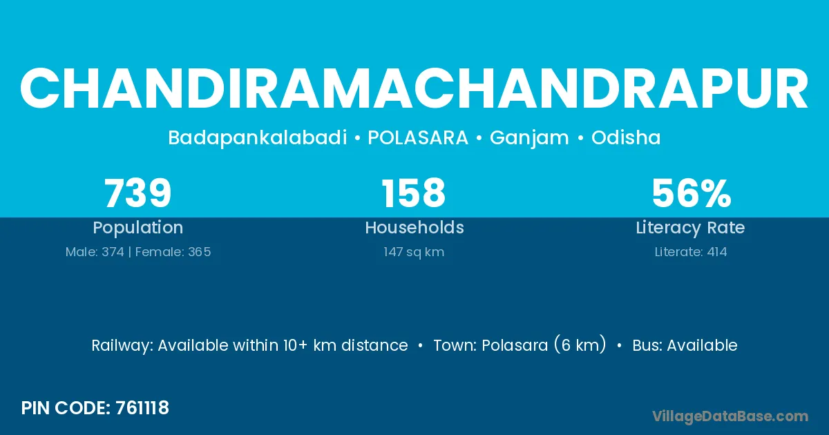 Polasara (6 km) is the nearest town to Chandiramachandrapur village for major economic activities and is located approximately 6 km away.