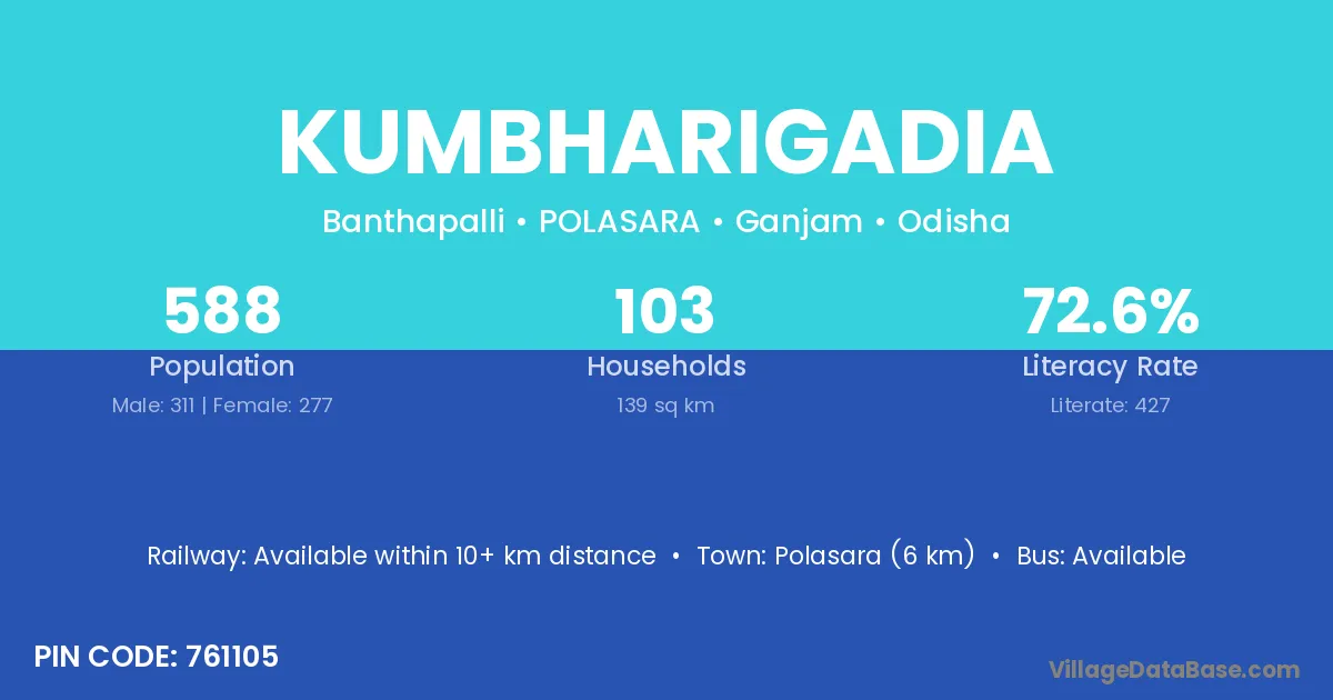 Polasara (6 km) is the nearest town to Kumbharigadia village for major economic activities and is located approximately 6 km away.