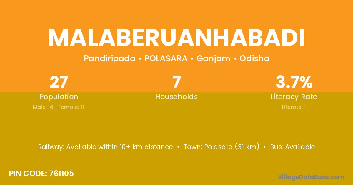 Polasara (31 km) is the nearest town to Malaberuanhabadi village for major economic activities and is located approximately 31 km away.