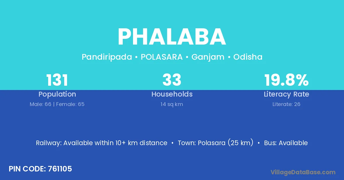 Polasara (25 km) is the nearest town to Phalaba village for major economic activities and is located approximately 25 km away.