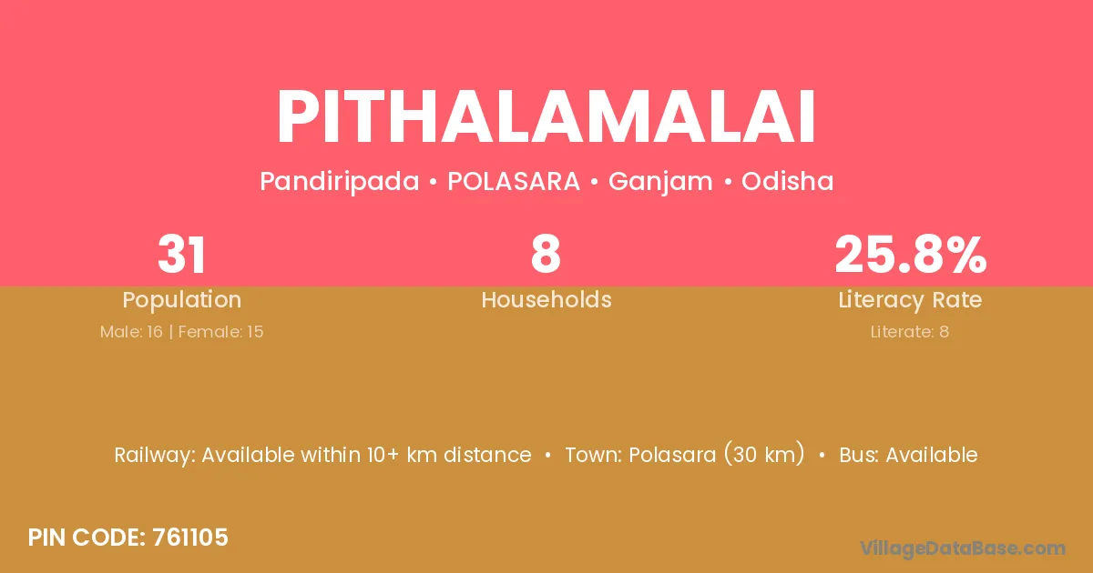 Polasara (30 km) is the nearest town to Pithalamalai village for major economic activities and is located approximately 30 km away.