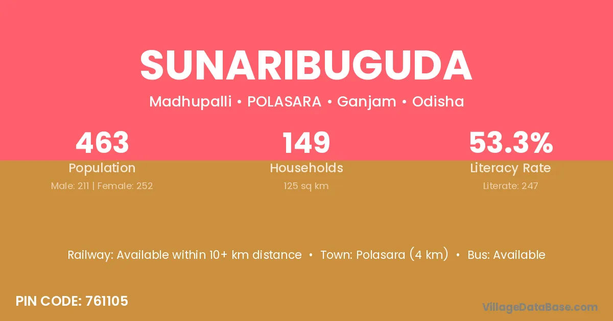 Polasara (4 km) is the nearest town to Sunaribuguda village for major economic activities and is located approximately 4 km away.