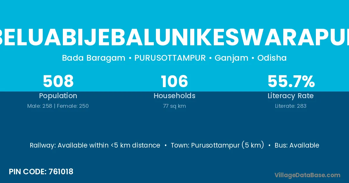 Purusottampur (5 km) is the nearest town to Beluabijebalunikeswarapur village for major economic activities and is located approximately 5 km away.