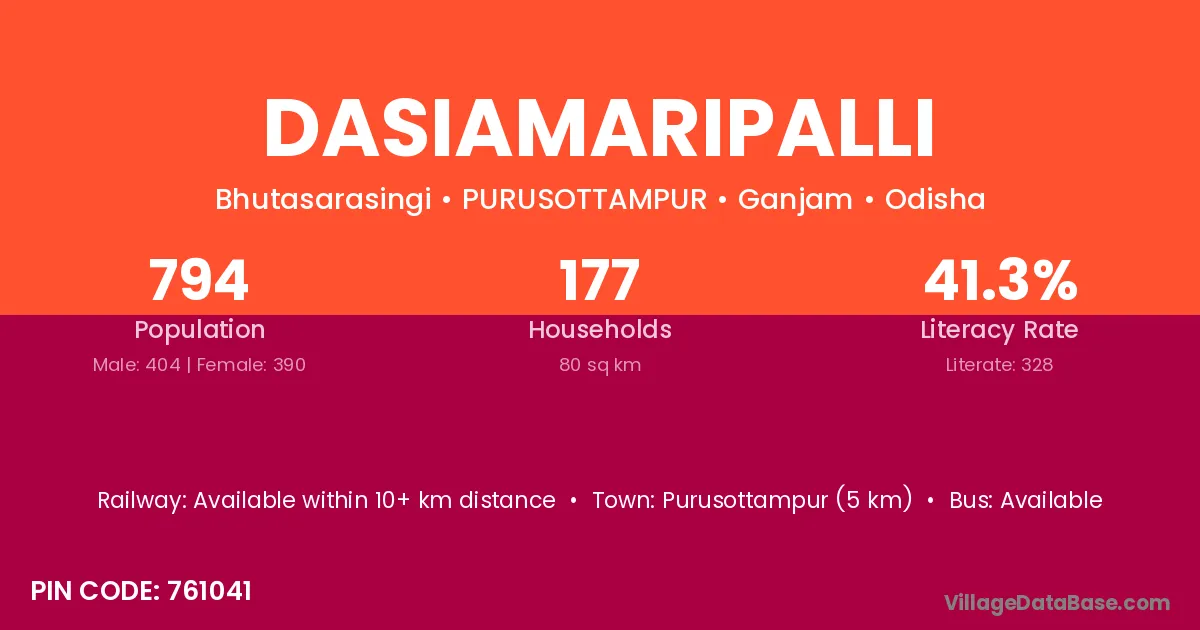 Purusottampur (5 km) is the nearest town to Dasiamaripalli village for major economic activities and is located approximately 5 km away.