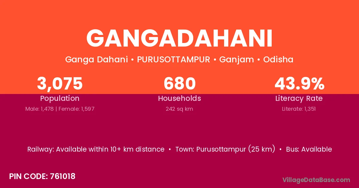 Purusottampur (25 km) is the nearest town to Gangadahani village for major economic activities and is located approximately 25 km away.