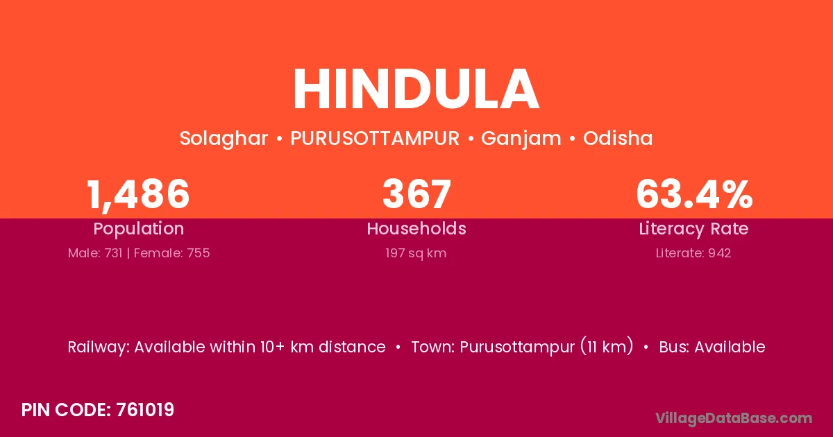 Purusottampur (11 km) is the nearest town to Hindula village for major economic activities and is located approximately 11 km away.